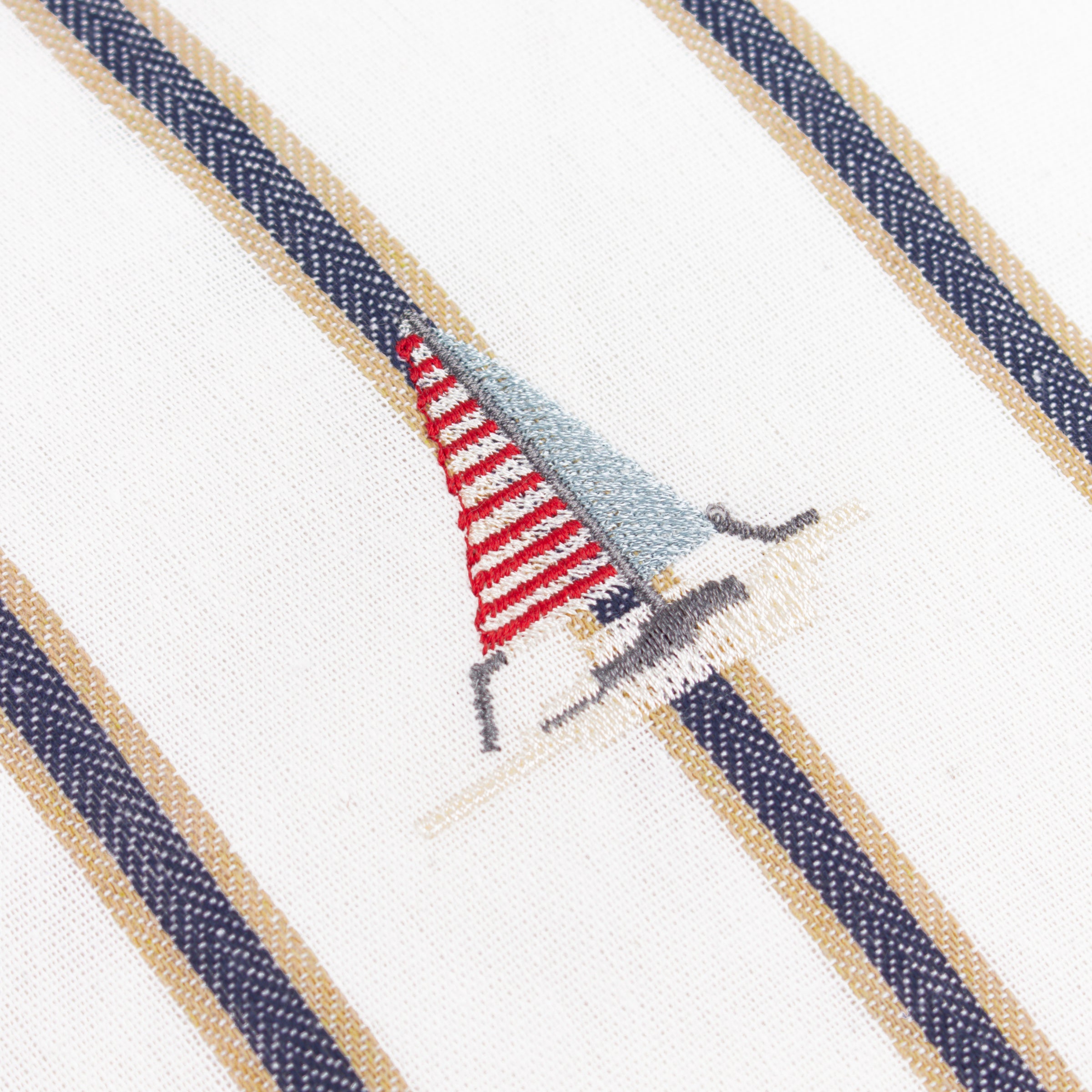 The Abersoch Regatta Cushion transforms living spaces with charming embroidered sailboats set against classic nautical stripes on yarn-dyed cotton fabric. This beautifully crafted coastal cushion brings seaside tranquillity to rooms with its timeless design.