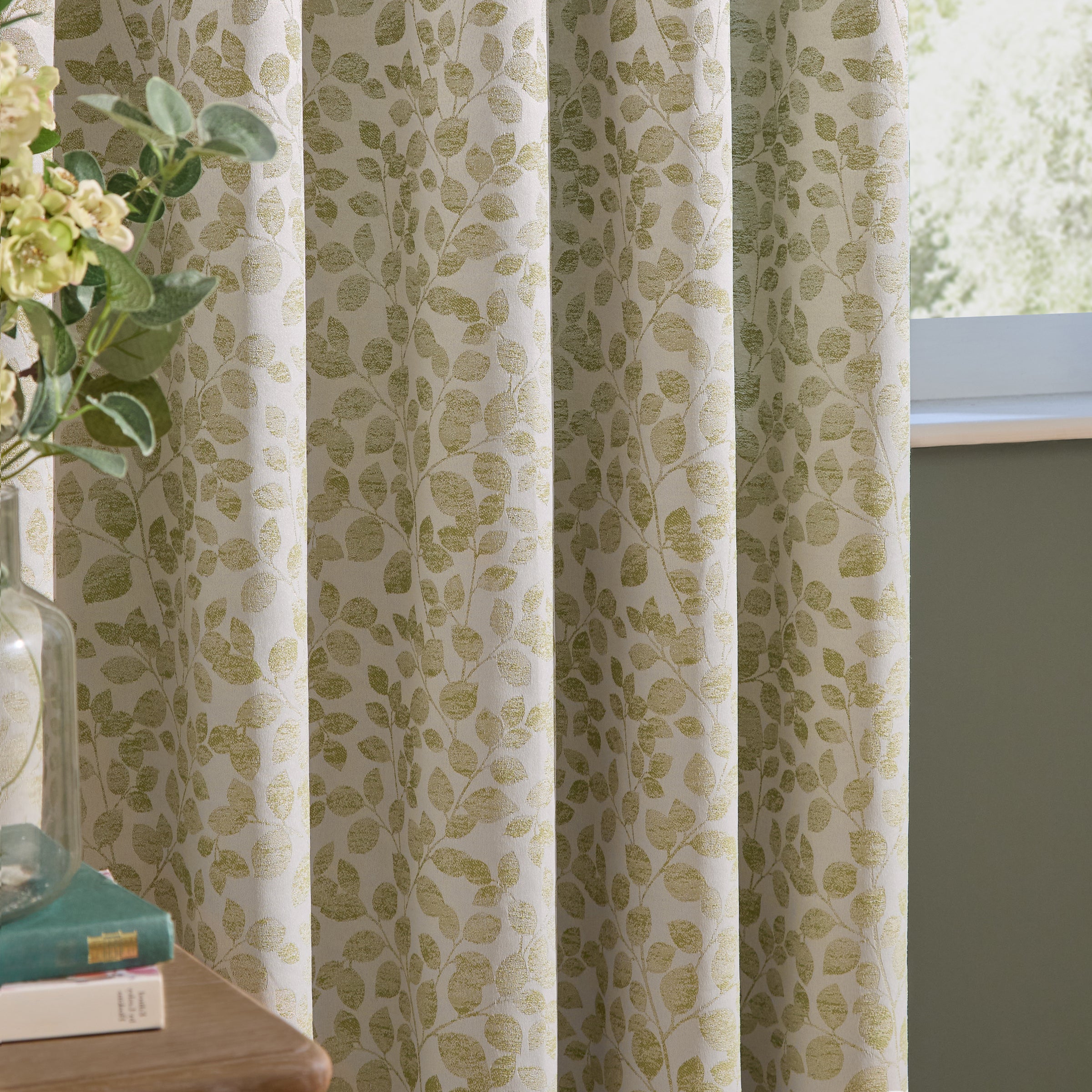 Grace Leaf Jacquard Fully Lined Pencil Pleat Curtains Sage