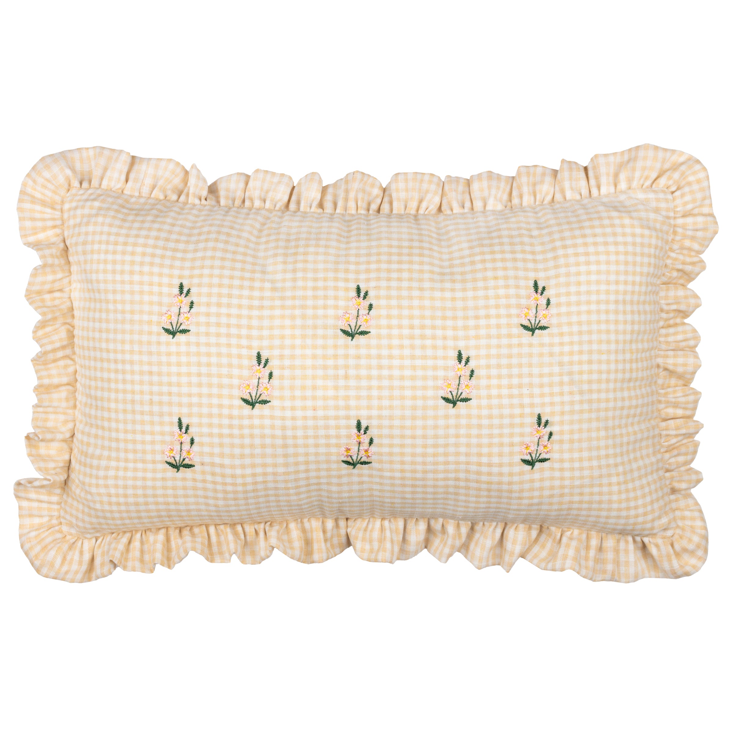 The Les Petite Fleurs cushion brings country charm to any space. This rectangular cushion is crafted from 100% cotton and showcases a classic gingham print with delicate embroidered flowers and playful frill trim. This cushion offers a simple way for homeowners to express personal style and create a space that feels uniquely theirs.