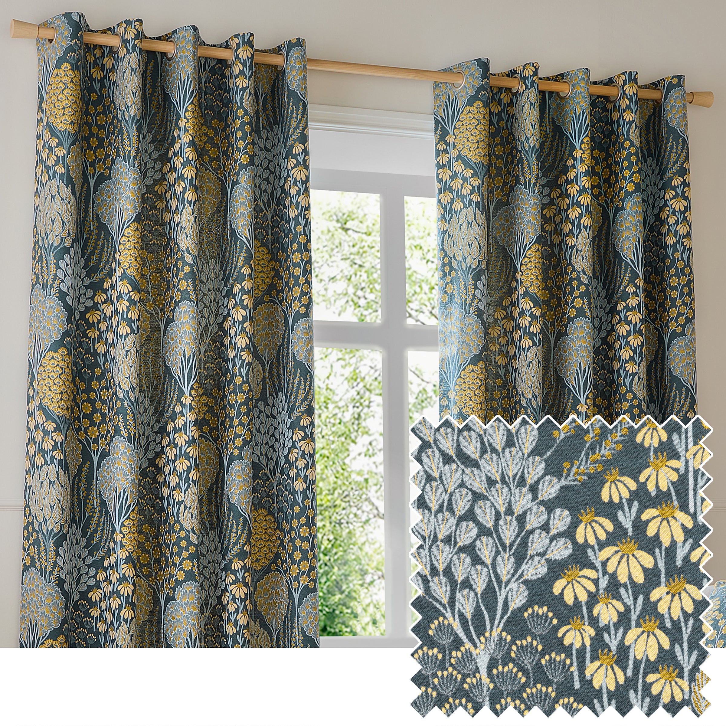 Ophelia Fully Lined Floral Jacquard Eyelet Curtains Blue/Saffron