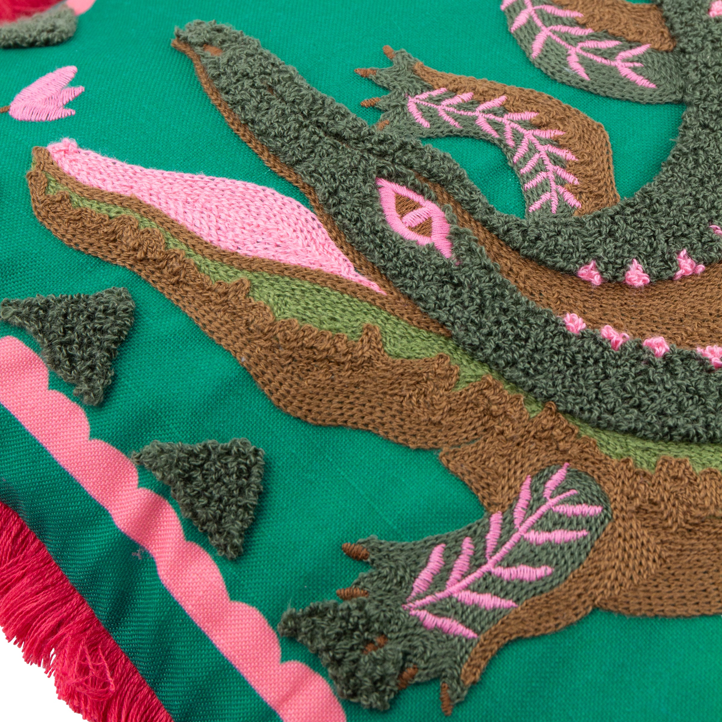 The Les Animaux Croc Monsieur cushion adds a playful touch to any interior. This piece features a daring crocodile in a tufted, embroidered design that brings instant personality to living spaces. The vibrant contrast colours are set against a simple canvas base, making it perfect for creating a statement piece. Finished with a tufted fringe trim, this cushion offers an easy way for homeowners to express their personal style.