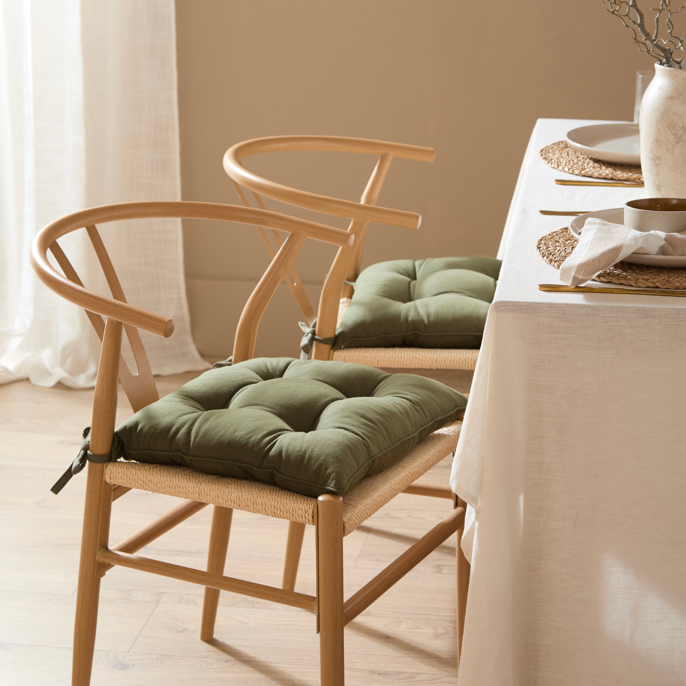 These Slub Cotton Seat Pads bring comfort to dining chairs. Sold as a twin pack, each pad is crafted from soft, 100% slub cotton for added comfort during meals. The classic, plain design and natural tones integrate seamlessly into any interior style. Finished with simple tie fastenings, these square cushions are a timeless addition to living spaces, making it easy to create a welcoming atmosphere.